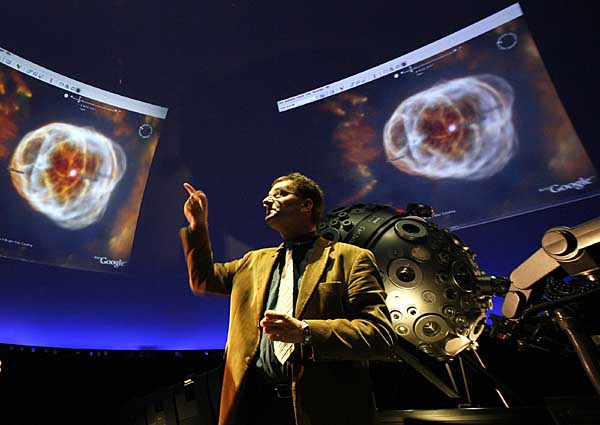 22日,在德國北部城市漢堡的天文館,天文館負(fù)責(zé)人托馬斯·克蘭普介紹谷歌公司的新產(chǎn)品“Google Sky”。據(jù)悉,“Google Sky”如同一個(gè)“虛擬天文望遠(yuǎn)鏡”,可使用戶在上億顆恒星間“遨游”。