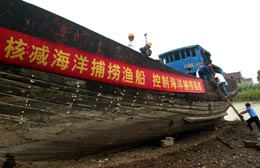 8月28日,工人在拆解報(bào)廢漁船。 當(dāng)日,農(nóng)業(yè)部漁業(yè)局及東海區(qū)漁政漁港監(jiān)督管理局在上海舉行回收的海洋捕撈漁船主機(jī)功率憑證集中銷毀儀式,同時(shí),對(duì)部分轉(zhuǎn)產(chǎn)報(bào)廢漁船進(jìn)行了現(xiàn)場(chǎng)拆解。據(jù)悉,由于我國目前海洋漁業(yè)資源持續(xù)衰退,現(xiàn)有捕撈力量嚴(yán)重過剩,到2010年,我國將消減三萬艘捕撈漁船,轉(zhuǎn)移約20萬勞動(dòng)力,以確保我國海洋漁業(yè)的可持續(xù)發(fā)展。 |