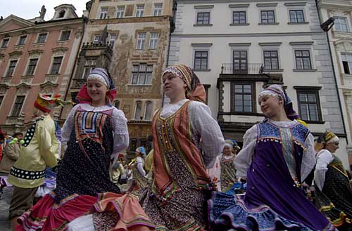 29日,來(lái)自俄羅斯的民俗團(tuán)體在捷克首都布拉格表演民族舞蹈。目前,一個(gè)名為“布拉格集市”的國(guó)際民俗節(jié)正在捷克首都布拉格舉行。