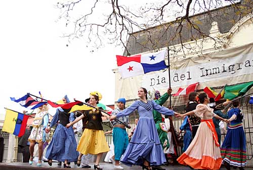 4日,在阿根廷首都布宜諾斯艾利斯移民局前舉行的慶祝移民節(jié)活動(dòng)上,演員們表演富有拉美和歐洲風(fēng)情的舞蹈。當(dāng)天,包括中國(guó)在內(nèi)的30多個(gè)國(guó)家的移民社團(tuán)參加了布宜諾斯艾利斯的移民節(jié)慶;顒(dòng)。