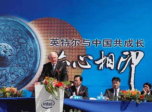 9月8日,美國(guó)英特爾公司大連芯片廠奠基典禮在大連經(jīng)濟(jì)技術(shù)開(kāi)發(fā)區(qū)舉行。根據(jù)中美雙方簽訂的合作協(xié)議,美國(guó)英特爾公司大連芯片廠首期投入25億美元,項(xiàng)目建設(shè)期為5年。正在大連參加夏季達(dá)沃斯年會(huì)的美國(guó)英特爾公司董事會(huì)主席克瑞格·貝瑞特、大連市市長(zhǎng)夏德仁出席奠基典禮出席奠基典禮。這是美國(guó)英特爾公司董事會(huì)主席克瑞格·貝瑞特在典禮上致辭。