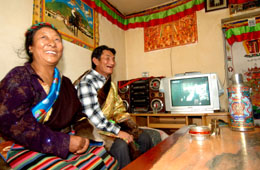 9月10日,兩位藏族老人在唐古拉山鄉(xiāng)生態(tài)移民小區(qū)自己家中收看電視節(jié)目。 從2003年國家實(shí)施三江源生態(tài)保護(hù)建設(shè)項(xiàng)目以來,整個(gè)三江源地區(qū)已有6000多戶、三萬多人從生態(tài)惡化嚴(yán)重地區(qū)搬遷出來,并在政府的幫助下融入城鎮(zhèn)。預(yù)計(jì)到2010年時(shí),三江源地區(qū)為保護(hù)當(dāng)?shù)厣鷳B(tài)環(huán)境而實(shí)施搬遷的藏族牧民將達(dá)到10萬人。