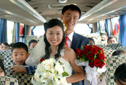 9月16日,參加“公交婚禮”的新人在公交婚慶車上接受親友祝福。當日,哈爾濱舉辦首屆“公交婚禮”,三對來自哈爾濱不同行業(yè)的新人參加了這次浪漫、環(huán)保的婚禮。據(jù)了解,這是2007年哈爾濱市城市公共交通周及無車日活動之一,旨在提倡節(jié)能減排,保護環(huán)境,拒絕浪費。