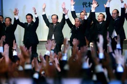 9月23日,在日本東京,日本前內(nèi)閣官房長官福田康夫(左三)與自民黨干事長麻生太郎(左二)等官員參加慶祝福田康夫當(dāng)選自民黨總裁的活動。福田康夫在當(dāng)天舉行的自民黨總裁選舉中以絕對優(yōu)勢擊敗競選對手麻生太郎,當(dāng)選自民黨第22任總裁。