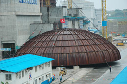 9月23日,在建設(shè)中的嶺澳核電站二期工地,巨型吊車將總重量達(dá)150多噸的核島穹頂凌空吊起,緩緩移向已完成土建施工的1號機(jī)組核島頂部,準(zhǔn)確地安放在預(yù)定位置。此舉標(biāo)志著嶺澳核電站二期1號機(jī)組核島實(shí)現(xiàn)封頂,從土建施工階段全面轉(zhuǎn)向設(shè)備安裝階段。