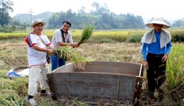 10月6日,兩位香港游客在婺源鄉(xiāng)間的稻田里體驗(yàn)收割稻谷農(nóng)事活動(dòng)。“十一”黃金周,江西婺源優(yōu)美的田園風(fēng)光和淳樸民風(fēng)民俗引來(lái)眾多中外游客,綠色環(huán)保的鄉(xiāng)村游深受游客青睞。