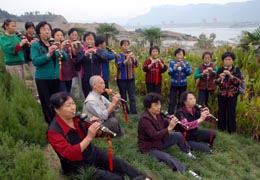 10月9日,湖北省秭歸縣一些移民在三峽壩前公園里學(xué)習(xí)演奏葫蘆絲。秭歸縣是三峽庫(kù)區(qū)移民人數(shù)較多的縣,動(dòng)態(tài)移民達(dá)10萬(wàn)人。移民搬遷后,縣里成立舞蹈隊(duì)、樂(lè)器演奏隊(duì)、健身隊(duì)等,以多種多樣的休閑活動(dòng)豐富移民生活。