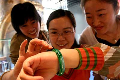 圖為消費者試戴一只價格昂貴的翡翠手鐲。日前,一家以零售為主、同時兼營珠寶租賃業(yè)務的珠寶店在北京市朝陽區(qū)開業(yè)。據(jù)介紹,珠寶租賃業(yè)務主要針對10萬元以上的高檔產(chǎn)品,顧客可以花較少的錢租用到價值昂貴的豪華珠寶首飾。