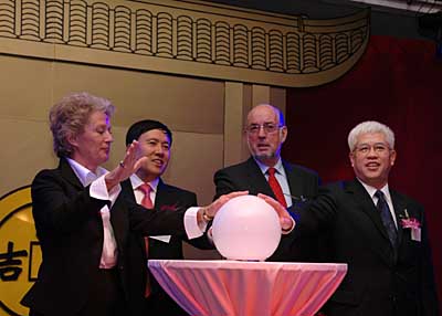 22日,德國法蘭克福市長佩特拉·羅特、中國交通銀行監(jiān)事長華慶山、德國聯(lián)邦銀行代表和中國駐德國大使館公參欽宏亮(從左至右)參加中國交通銀行法蘭克福分行開業(yè)典禮。當日,中國交通銀行在德國法蘭克福位于核心金融區(qū)的分行辦公樓舉行揭牌儀式,宣布該行首家歐洲分行在法蘭克福開業(yè)。