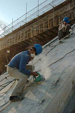 22日,兩名中國工人在蘇丹首都喀土穆以北的麥羅維大壩施工現(xiàn)場施工。麥羅維大壩位于喀土穆以北約450公里處的尼羅河上,由中國水利電力對(duì)外公司和中國水利水電建設(shè)集團(tuán)公司承建,是迄今為止中國企業(yè)承包的最大國際工程,也是蘇丹乃至非洲目前在建的最大水電項(xiàng)目。大壩于2003年7月開工,預(yù)期2008年完工。