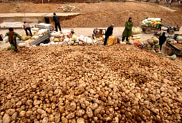金秋十月,青海省互助土族自治縣近30萬畝馬鈴薯喜獲豐收。青海省互助土族自治縣生產(chǎn)的馬鈴薯具有優(yōu)質(zhì)豐產(chǎn)、退化慢等優(yōu)良特點,產(chǎn)品在國內(nèi)市場十分暢銷。這是青海省互助土族自治縣農(nóng)民在搬運即將外銷的馬鈴薯。