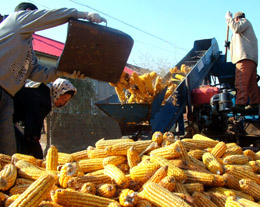 10月29日,海林市江北村村民給玉米脫粒。黑龍江省海林市是全國綠色食品原料(水稻、玉米、大豆)標準化生產(chǎn)基地,目前該基地種植的80萬畝水稻、玉米、大豆等農(nóng)作物喜獲豐收。
