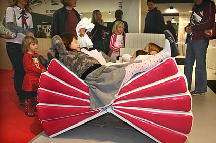 4日,小朋友們?cè)谝獯罄_馬新國(guó)際展覽中心舉辦的家具展上體驗(yàn)新式沙發(fā)。為期9天的羅馬國(guó)際家具展當(dāng)天在羅馬新國(guó)際展覽中心閉幕。節(jié)省空間、新穎別致和極具人性化的設(shè)計(jì)風(fēng)格是本屆展會(huì)的突出特點(diǎn)。