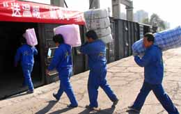 11月10日,工人在將捐獻物資裝上貨車。 今年以來,我國部分地區(qū)遭受了嚴重自然災(zāi)害。嚴冬即將到來,黨中央、國務(wù)院十分關(guān)心災(zāi)區(qū)人民和困難群眾的過冬問題,明確要求各地區(qū)各部門深入開展“送溫暖、獻愛心”活動,廣泛動員各方面力量,積極為災(zāi)區(qū)人民和困難群眾捐款捐物,切實幫助他們排憂解難,以實際行動貫徹落實黨的十七大精神。中直機關(guān)各部門各單位積極響應(yīng)中央號召,截至目前,中直機關(guān)已收到捐款約600萬元、棉衣棉被約三萬件。 |
