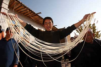 11月13日,循化縣新建村一位撒拉族青年在家中與朋友切磋拉面技藝。 今年以來(lái),共青團(tuán)青海省委與國(guó)家開(kāi)發(fā)銀行青海分行聯(lián)合向循化撒拉族自治縣新建村65位青年農(nóng)民發(fā)放總額為520萬(wàn)元的“青年創(chuàng)業(yè)小額貸款”,并組織他們進(jìn)行拉面技術(shù)、市場(chǎng)分析和創(chuàng)業(yè)能力等方面的培訓(xùn),幫助當(dāng)?shù)厍嗄暝谌珖?guó)開(kāi)展以拉面飲食經(jīng)濟(jì)為帶頭產(chǎn)業(yè)的創(chuàng)業(yè)活動(dòng)。 | |