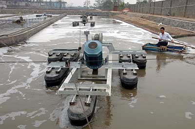 廣西來賓一企業(yè)的技術人員在污水處理池內檢查設備運轉情況(11月14日攝)。