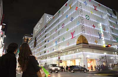 17日,在日本東京繁華的銀座商業(yè)區(qū),松屋百貨大樓被用“路易·威登”的經(jīng)典圖案裝扮成一只巨大的“路易·威登”旅行箱,以招徠顧客。