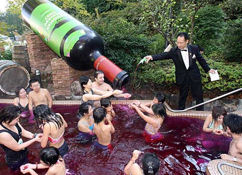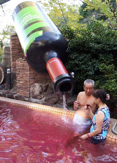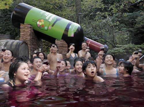 人們在日本箱根享受葡萄酒浴,慶!安┤羧R”鮮葡萄酒開瓶日。 11月的第三個星期四,是一年一度的“博若萊”鮮葡萄酒開瓶日!安┤羧R”鮮葡萄酒是葡萄酒愛好者能喝到的法國當年第一款新酒,品嘗該酒可以對法國當年葡萄酒的品質(zhì)和年景有基本判斷,因此,具有法國葡萄酒“年景評估尺”的美譽!安┤羧R”鮮葡萄酒深受日本人的歡迎,今年約進口840萬瓶。