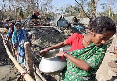 25日,在孟加拉國的強(qiáng)熱帶風(fēng)暴“錫德”受災(zāi)地區(qū),一名婦女往自己的帳篷里運水。孟加拉國三軍總參謀官馬蘇德當(dāng)日在首都達(dá)卡對媒體表示,強(qiáng)熱帶風(fēng)暴“錫德”對孟造成的經(jīng)濟(jì)損失初步估算達(dá)23.1億美元。