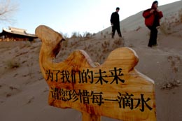 11月29日,幾名游客從月牙泉旁矗立的節(jié)水宣傳牌旁走過。 近日,為有效遏制敦煌生態(tài)環(huán)境惡化勢頭,保護(hù)月牙泉、鳴沙山這一沙泉相伴的自然奇觀,甘肅省啟動(dòng)月牙泉景區(qū)治理工程。該工程計(jì)劃投資7081萬元,通過月牙泉水位下降應(yīng)急治理工程和鳴沙山山體保護(hù)工程,治理流沙對月牙泉的侵害,對其周圍區(qū)域生態(tài)環(huán)境進(jìn)行保護(hù)。 |