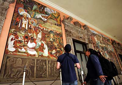 4日,在墨西哥城的國民宮,游人參觀剛剛維修過的墨西哥著名壁畫家迭戈·里維拉創(chuàng)作的反映古代印第安人生活的壁畫。