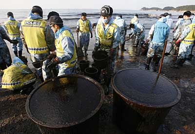 9日,志愿者在韓國忠清南道泰安郡附近的海灘上清理泄漏的原油。韓國海洋水產(chǎn)部長官姜武賢9日說,韓國西部海域發(fā)生的原油泄漏事故已造成大面積環(huán)境污染,預(yù)計(jì)清理工作將持續(xù)兩個(gè)月。一艘在香港注冊的油輪7日在韓國忠清南道泰安郡西北海域與一艘韓國駁船相撞,超過1萬噸的原油漏入大海。