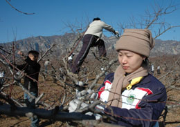 12月13日,河南農(nóng)業(yè)大學林學園藝學院的幾名大學生在果園幫助果農(nóng)修剪果樹。近日,河南農(nóng)業(yè)大學林學園藝學院的160名本科生和研究生,來到位于太行山腳下的河南省沁陽市紫陵鎮(zhèn)紫陵村萬畝無公害經(jīng)濟林園區(qū),開展為期一周的社會實踐活動。學生們對當?shù)毓r(nóng)進行技術培訓,并幫助果農(nóng)對桃樹、杏樹、梨樹進行冬季剪枝管理。 |