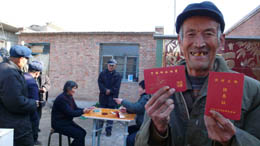 12月13日,河北省東光縣大曹村生活困難的五保農(nóng)民高興地領(lǐng)取供養(yǎng)金。國(guó)家級(jí)貧困縣東光縣今年籌措資金270多萬(wàn)元,將全縣2200名五保農(nóng)民全部納入縣財(cái)政供養(yǎng)范圍,每月每人發(fā)放一百元供養(yǎng)金。