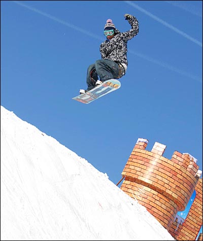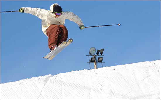 首屆中國大連國際溫泉滑雪節(jié)日前在大連安波溫泉滑雪場啟幕。圖為滑雪運動員現(xiàn)場進行精彩的滑雪表演。