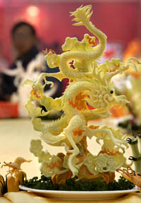 12月20日,參觀者在觀看宿遷餐飲展位上的食品雕刻。當日,江蘇省第二屆餐飲業(yè)成果展暨第五屆烹飪技術(shù)比賽在南京城市規(guī)劃建設(shè)展覽館開幕,全省各地的餐飲展位以及數(shù)百個參賽團體和單項選手制作的創(chuàng)新菜肴,讓參觀者享受到一場豐盛的美食“盛宴”。