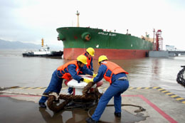 全國(guó)最大商用石油和保稅油品倉儲(chǔ)企業(yè)中化興中石油轉(zhuǎn)運(yùn)(舟山)有限公司所屬岙山基地,2007年年吞吐各類油品達(dá)1539.41萬噸。圖為一艘30萬噸級(jí)油輪“阿波羅榮耀”號(hào)裝載11萬噸燃料油靠泊在岙山基地。
