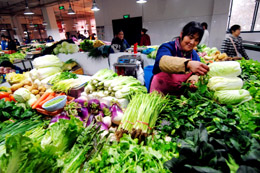 1月8日,一名蔬菜攤主在整理自家菜攤上的蔬菜。 為穩(wěn)定以豬肉為重點的副食品價格,杭州市不斷深化“微利肉”“讓利菜”等銷售活動,并把讓利銷售的品種范圍擴大到禽蛋等主要副食品。為此,杭州市工商局等部門從2008年1月至3月繼續(xù)對市區(qū)農(nóng)貿(mào)市場的豬肉、大路蔬菜經(jīng)營戶適當減免市場攤位費。自2007年8月份開展“微利售肉”活動以來,杭州市共有104家大型超市、農(nóng)貿(mào)市場和零售肉店參與了此項活動。 |