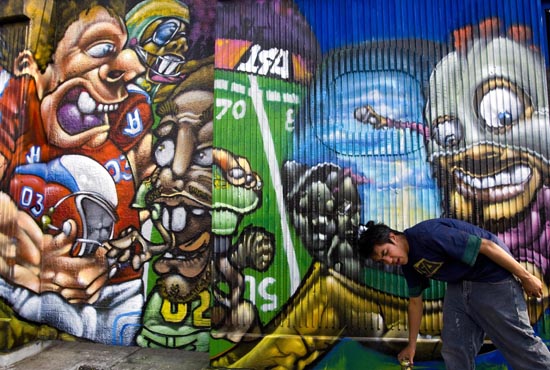 13日,一名參加涂鴉比賽的男子在墨西哥首都墨西哥城的阿茲特克體育場外墻上創(chuàng)作。為了減少在該體育場外墻上的亂涂亂畫,墨西哥城官方和阿茲特克體育場聯(lián)合舉辦了這次涂鴉比賽,比賽優(yōu)勝者獎金為1500美元,入圍的300幅作品還被獲準(zhǔn)畫在體育場外墻上。
