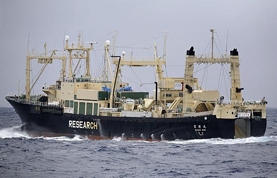 這張1月12日由綠色和平組織“埃斯佩蘭薩”號船只提供的照片顯示的是日本捕鯨船“日新丸”號行駛在南太平洋海域。綠色和平組織14日說,他們兩天前將日本捕鯨船隊的“鯨魚加工”船成功逐出捕鯨區(qū),阻撓了日本在南極洲附近海域的捕鯨活動。