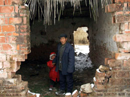 安徽省鳳臺(tái)縣桂集鄉(xiāng)后胡村村民陳勇與小女兒站在剛搬出的原住房里(1月15日攝)。他們現(xiàn)臨時(shí)住在鄰居家。 安徽省鳳臺(tái)縣桂集鄉(xiāng)后胡村,位于淮河支流的澮河邊。2007年夏,淮河發(fā)生了1954年以來(lái)最大的全流域洪水,后胡村嚴(yán)重受災(zāi),倒房近30戶。災(zāi)情發(fā)生后,當(dāng)?shù)卣?jì)劃將20戶災(zāi)民集中安置。災(zāi)民安置房設(shè)計(jì)標(biāo)準(zhǔn)為每戶125平方米的兩層小樓,標(biāo)準(zhǔn)偏高,除政府補(bǔ)貼外,每戶災(zāi)民需自籌6萬(wàn)多元。但是,災(zāi)民普遍經(jīng)濟(jì)困難,無(wú)力承擔(dān)高昂費(fèi)用,導(dǎo)致房屋建設(shè)后續(xù)資金中斷。工程自2007年12月初被迫停工以來(lái),一直未得到妥善解決,被當(dāng)?shù)厝罕姺Q(chēng)為“爛尾樓”。目前,災(zāi)民不得不繼續(xù)住在嚴(yán)重受損的房屋內(nèi)。 |