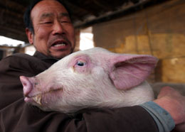 1月17日,在甘肅省天水市麥積區(qū)甘泉鎮(zhèn)的一處養(yǎng)殖基地內(nèi),農(nóng)民阮清平正抱著繁育的良種豬仔。 針對(duì)肉蛋奶等農(nóng)產(chǎn)品價(jià)格大幅上漲的情況,今年甘肅將重點(diǎn)扶持新建標(biāo)準(zhǔn)化養(yǎng)殖小區(qū)500個(gè),擴(kuò)大養(yǎng)殖規(guī)模,增加出欄量和市場(chǎng)供應(yīng),突出加強(qiáng)生豬良種繁育體系和標(biāo)準(zhǔn)化規(guī)模養(yǎng)殖場(chǎng)建設(shè),力爭(zhēng)豬肉產(chǎn)量達(dá)到70萬(wàn)噸,肉蛋奶產(chǎn)量達(dá)到170萬(wàn)噸,增長(zhǎng)9.7%。