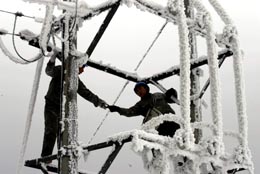 1月23日,電力工人搶修輸電線路。由于連續(xù)十多天出現(xiàn)冰凍天氣,湖北宜昌五峰縣山區(qū)供電設(shè)施遭到嚴(yán)重破壞。當(dāng)?shù)仉娏窘M織8支突擊搶修隊搶修線路,確保山區(qū)群眾用電。