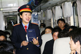 1月31日凌晨,列車長在車廂內(nèi)向旅客介紹停車時(shí)的安全事項(xiàng)。 當(dāng)日6時(shí)許,往返于沈陽和廣州間、因暴風(fēng)雪晚點(diǎn)近80個(gè)小時(shí)的T12/T14次列車在經(jīng)過了6天6夜的艱難旅程后,安全返回沈陽北站。面對(duì)幾十年不遇的冰雪災(zāi)害,沈陽鐵路局沈陽客運(yùn)段T12/T14次“三八乘務(wù)組”的64名女乘務(wù)員以頑強(qiáng)的意志和耐心細(xì)致的服務(wù)克服了列車嚴(yán)重超員、食品飲用水缺乏等諸多困難,贏得了旅客的理解和支持,與3000多名旅客一起平安返回家園。 |