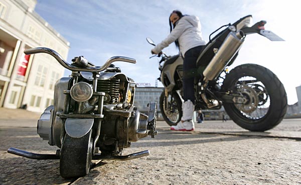 1月31日,在德國萊比錫舉行的摩托車展示會上,一名騎著普通摩托車的女子觀看一輛2公斤重的迷你摩托車。這種摩托車只有人腳大小,時速卻可達(dá)到20公里。新華社/法新