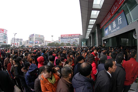 2月12日,南充火車站站前廣場上站滿了排隊購票的旅客。