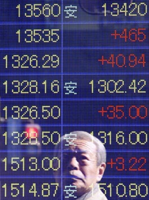 14日,在日本首都東京,一名男子在觀看顯示市場信息的電子顯示牌。日本內(nèi)閣府當(dāng)日公布的初步統(tǒng)計數(shù)據(jù)顯示,去除物價變動因素后,2007年第四季度日本國內(nèi)生產(chǎn)總值比上季度增長0.9%,按年率計算增幅為3.7%,這是日本經(jīng)濟(jì)連續(xù)第二個季度出現(xiàn)增長。新華社/路透