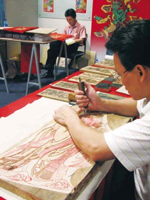 年畫如今在城市里已很少能見到,而藝人刻版技藝表演也只有在展覽會(huì)中才能參觀到。陳輝/攝 | 年畫市場復(fù)蘇