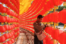 2月20日,一名工作人員檢查安裝好的紅燈籠。為迎接元宵佳節(jié),廣東省惠州市在濱江公園舉辦的大型游園燈會已準備就緒,近萬盞紅燈籠將公園裝扮一新。