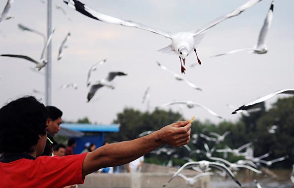 24日,游客在位于泰國中部北欖府挽布縣的挽布鳥類濕地保護區(qū)給鳥喂食。挽布鳥類濕地保護區(qū)是泰國最大的濱海人工鳥類濕地保護區(qū)。保護區(qū)人工種植數(shù)十萬株紅樹,在固沙保堤的同時成為鳥類棲息的家園,目前共有包括棕頭鷗、白鷺、翠鳥等140多種鳥類季節(jié)性在此棲息繁衍。