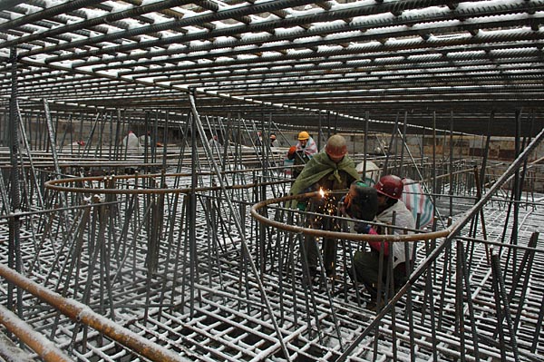 經(jīng)過建設(shè)者十余年的艱苦奮戰(zhàn),目前三峽工程建設(shè)已進(jìn)入最后沖刺階段,升船機(jī)續(xù)建、地下電站等項(xiàng)目正在加緊建設(shè)中。三峽工程初步設(shè)計(jì)中的26臺70萬千瓦機(jī)組,將于2008年底全部安裝完成投入運(yùn)行,比原計(jì)劃提前一年。圖為葛洲壩集團(tuán)公司職工在三峽工程升船機(jī)底板部位安裝鋼筋網(wǎng),以便進(jìn)行混凝土澆筑。