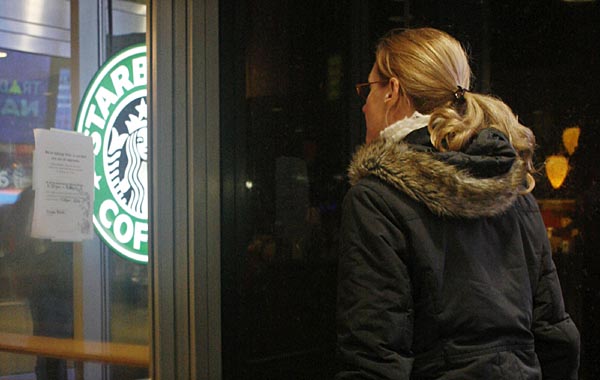 26日,一名行人在美國紐約一家星巴克咖啡店外觀看閉店通知。美國咖啡連鎖店巨頭星巴克當(dāng)日將全國7100家分店關(guān)閉3小時(shí),對所有員工進(jìn)行烹制咖啡的培訓(xùn)。目前美國餐飲連鎖行業(yè)競爭激烈,因遭遇麥當(dāng)勞等競爭對手挑戰(zhàn),星巴克上周宣布裁員600人。新華社/路透