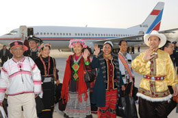 圖為來自云南的全國政協(xié)委員乘飛機抵達北京西郊機場。