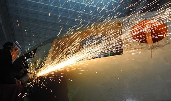 一名建設(shè)者在打磨三峽右岸電站19號(hào)水輪發(fā)電機(jī)組的機(jī)組頂蓋(3月5日攝)。 經(jīng)過(guò)建設(shè)者多年的艱苦奮戰(zhàn),三峽工程初步設(shè)計(jì)中的26臺(tái)70萬(wàn)千瓦機(jī)組,將于2008年底全部投產(chǎn)。從2003年7月三峽首臺(tái)機(jī)組投產(chǎn),目前已有21臺(tái)機(jī)組并網(wǎng)發(fā)電,其中左岸電站14臺(tái)于2005年9月全部投運(yùn),右岸電站已有7臺(tái)投入發(fā)電。目前,右岸余下的5臺(tái)機(jī)組安裝均按計(jì)劃有序進(jìn)行。 | |