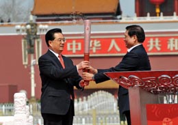 胡錦濤接過(guò)中共中央政治局委員、北京市委書(shū)記、北京奧組委主席劉淇手中的火炬。