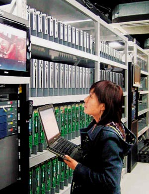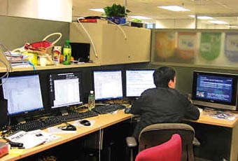 Lab里,顯示器和主機成排地站在架子上,簡直像一個儲藏電腦的倉庫。 這里大多4人共用一個格子間,格子間外側貼有桌子編號和個人的中英文名字。室內很安靜,大家都在對著各自的電腦忙碌著——幾乎每人面前,都至少擺著兩臺顯示器,并外加一臺筆記本電腦!皟膳_顯示器連接的是一臺主機,有關的內容可以在兩個顯示屏間直接拖動,這樣操作時就不用切換屏幕,節(jié)約工作時間!盚anna介紹說。